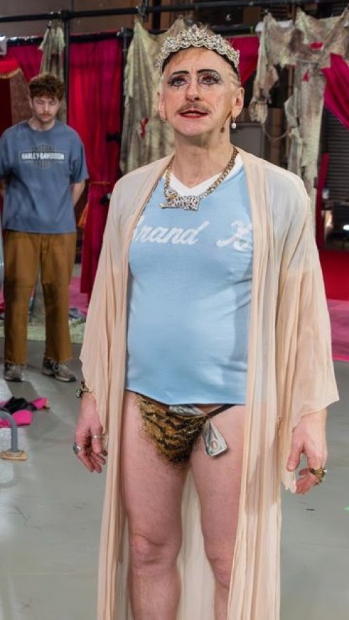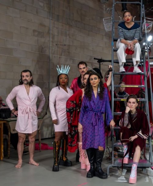 The audience sits on vintage chairs or stands during the opening lobby-set sequence which has the nude cast enacting sex worker and client bits from The Balcony for about 12 minutes. “I don’t come to this place for truth; I come for illusion!” Due to the nudity, smart phones are checked in beforehand. The gold rope is raised, the lavish red curtains are drawn, and the audience enters the auditorium.